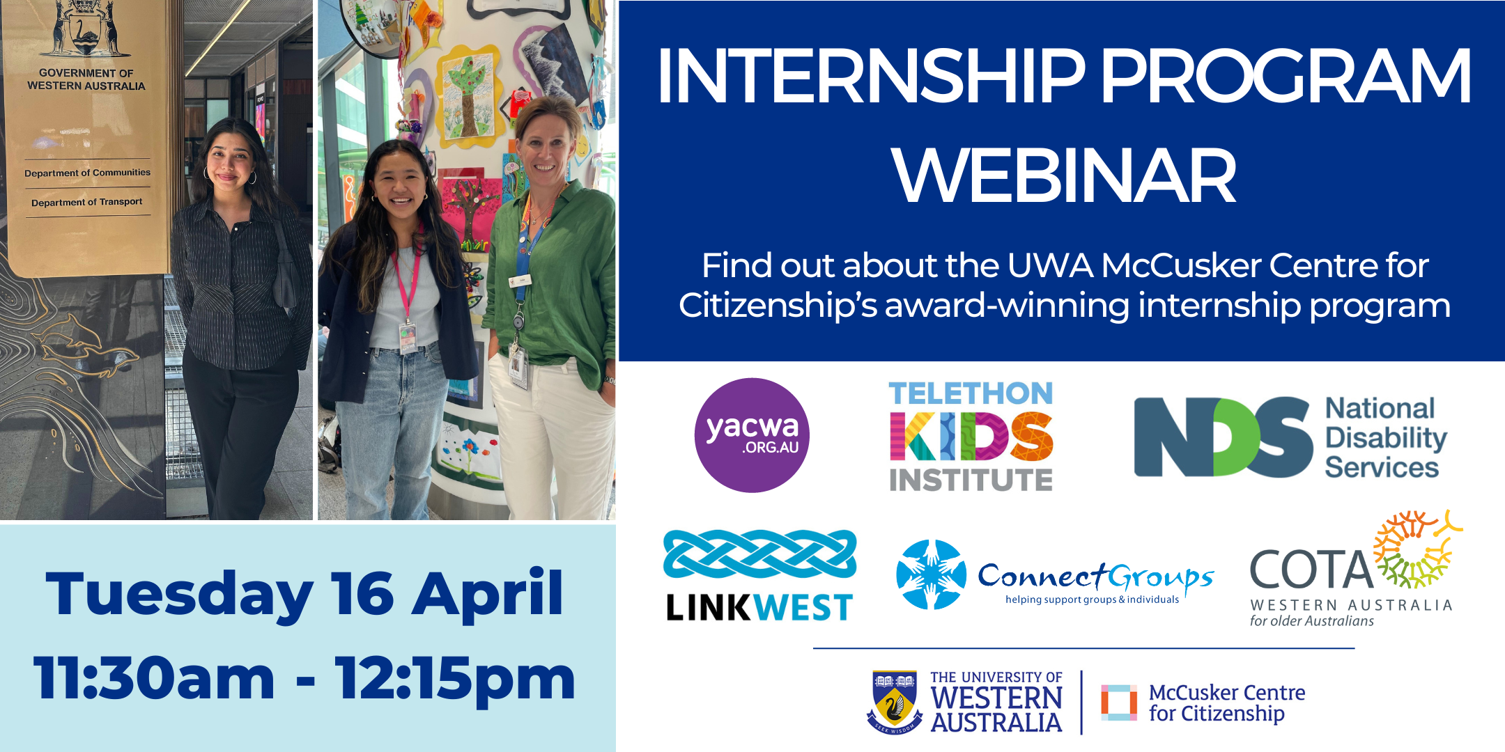 The McCusker Centre for Citizenship at UWA offers students opportunities to make meaningful contributions to the work of not-for-profit and community organisations through our award-winning internship program.