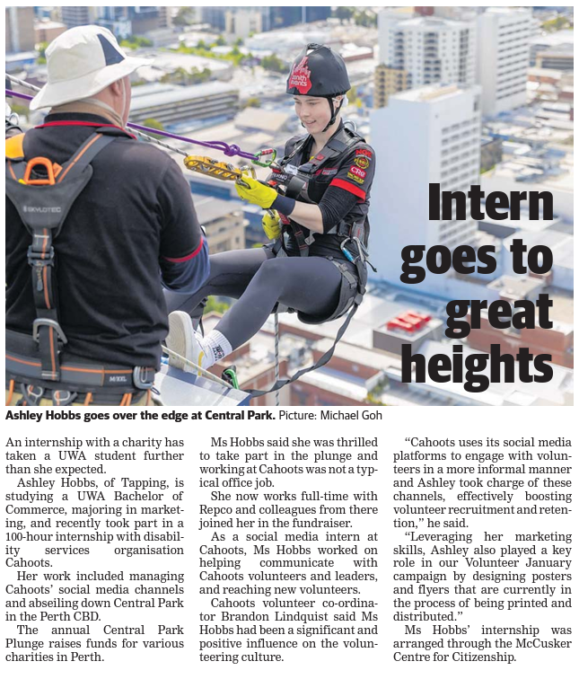 Her work included managing Cahoots’ social media channels — and abseiling down Central Park in the Perth CBD.